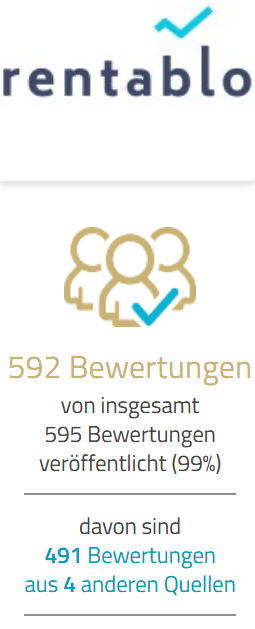 Auf der Bewertungsplattform ProvenExpert ist bei Rentablo keine durchschnittliche Bewertung ersichtlich. Rentablo wurde dort nicht als „Top Dienstleister“ oder „Top Empfehlung“ ausgezeichnet. Von den angegebenen 592 Bewertungen sind 491 Bewertungen nicht verifiziert, da sie aus externen Quellen importiert wurden.